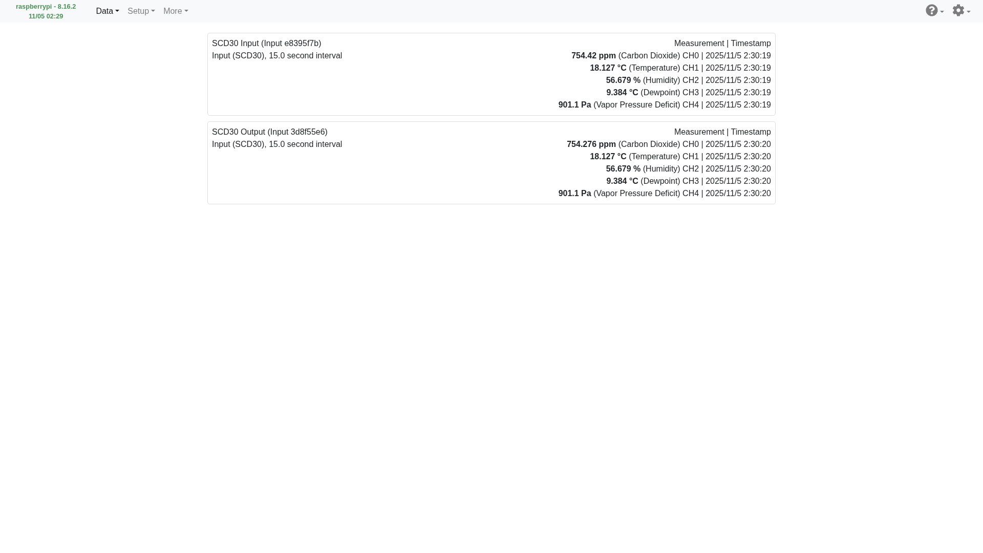 2025-11-05 03:58:13,805 - DEBUG - mycodo.controllers.controller_input_e8395f7b - Adding measurements to InfluxDB with ID e8395f7b-1d56-4518-ac4d-450ee2df7b57: {0: {'measurement': 'co2', 'unit': 'ppm', 'value': 805.7415161132812, 'timestamp_utc': datetime.datetime(2025, 11, 4, 16, 58, 13, 769185)}, 1: {'measurement': 'temperature', 'unit': 'C', 'value': 17.49103546142578, 'timestamp_utc': datetime.datetime(2025, 11, 4, 16, 58, 13, 769197)}, 2: {'measurement': 'humidity', 'unit': 'percent', 'value': 56.96258544921875, 'timestamp_utc': datetime.datetime(2025, 11, 4, 16, 58, 13, 769203)}, 3: {'measurement': 'dewpoint', 'unit': 'C', 'value': 8.863754183078429, 'timestamp_utc': datetime.datetime(2025, 11, 4, 16, 58, 13, 769231)}, 4: {'measurement': 'vapor_pressure_deficit', 'unit': 'Pa', 'value': 860.0787704045279, 'timestamp_utc': datetime.datetime(2025, 11, 4, 16, 58, 13, 769251)}}