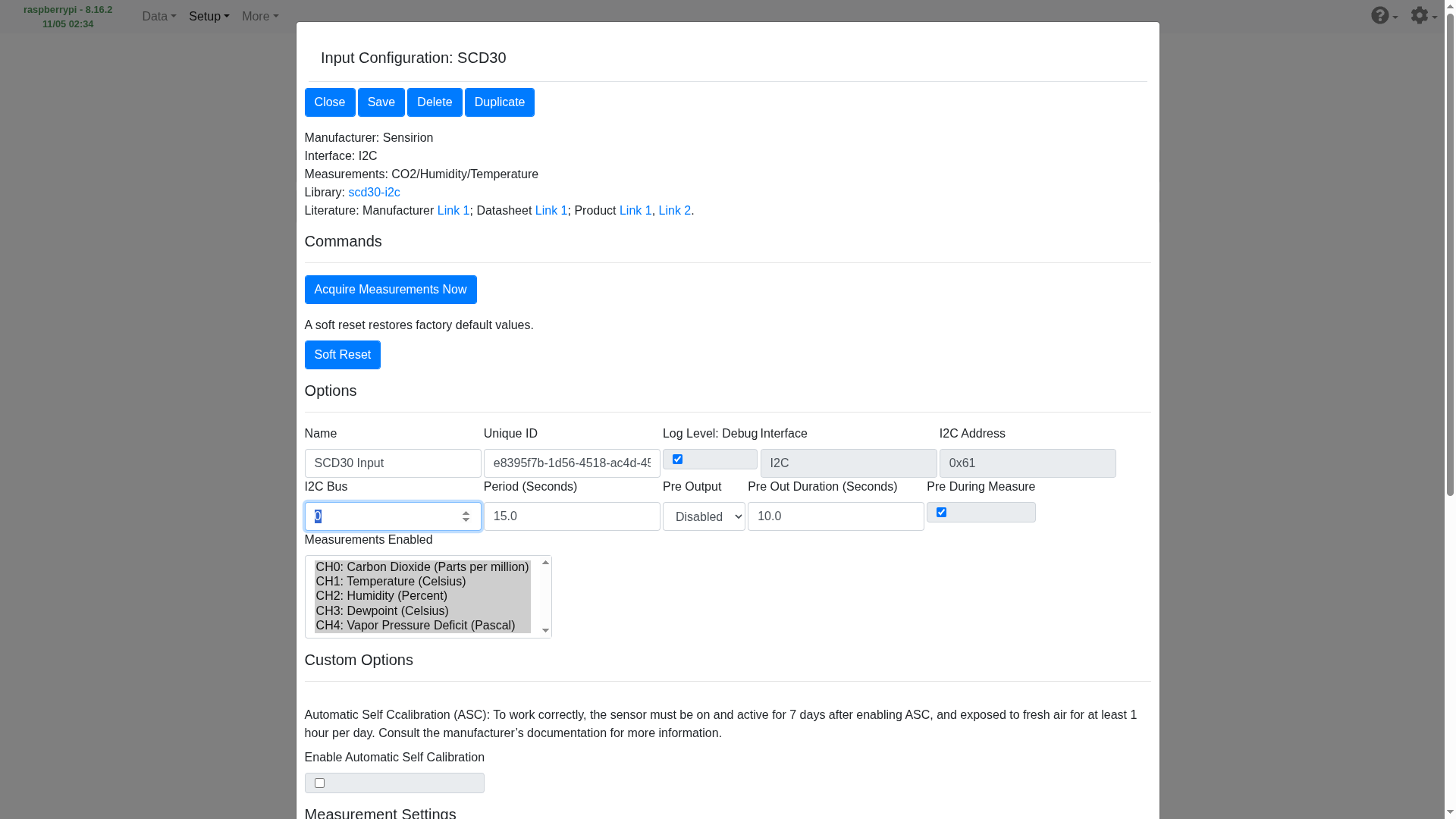 2025-11-05 03:57:04,567 - DEBUG - mycodo.controllers.controller_input_e8395f7b - Adding measurements to InfluxDB with ID e8395f7b-1d56-4518-ac4d-450ee2df7b57: {0: {'measurement': 'co2', 'unit': 'ppm', 'value': 4224.31640625, 'timestamp_utc': datetime.datetime(2025, 11, 4, 16, 57, 4, 545294)}, 1: {'measurement': 'temperature', 'unit': 'C', 'value': 17.859539031982422, 'timestamp_utc': datetime.datetime(2025, 11, 4, 16, 57, 4, 545305)}, 2: {'measurement': 'humidity', 'unit': 'percent', 'value': 83.013916015625, 'timestamp_utc': datetime.datetime(2025, 11, 4, 16, 57, 4, 545310)}, 3: {'measurement': 'dewpoint', 'unit': 'C', 'value': 14.932831210448269, 'timestamp_utc': datetime.datetime(2025, 11, 4, 16, 57, 4, 545340)}, 4: {'measurement': 'vapor_pressure_deficit', 'unit': 'Pa', 'value': 347.43479811900863, 'timestamp_utc': datetime.datetime(2025, 11, 4, 16, 57, 4, 545359)}}